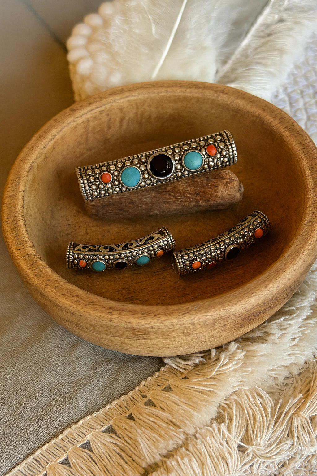 Decorá tus dreadlocks con estos pasantes boho de metal trabajado, embellecidos con colores en tonos turquesa, negro y coral. Cada pieza es única y aporta un toque tribal y místico, convirtiéndose en un amuleto que viaja con vos.